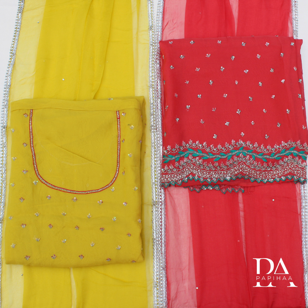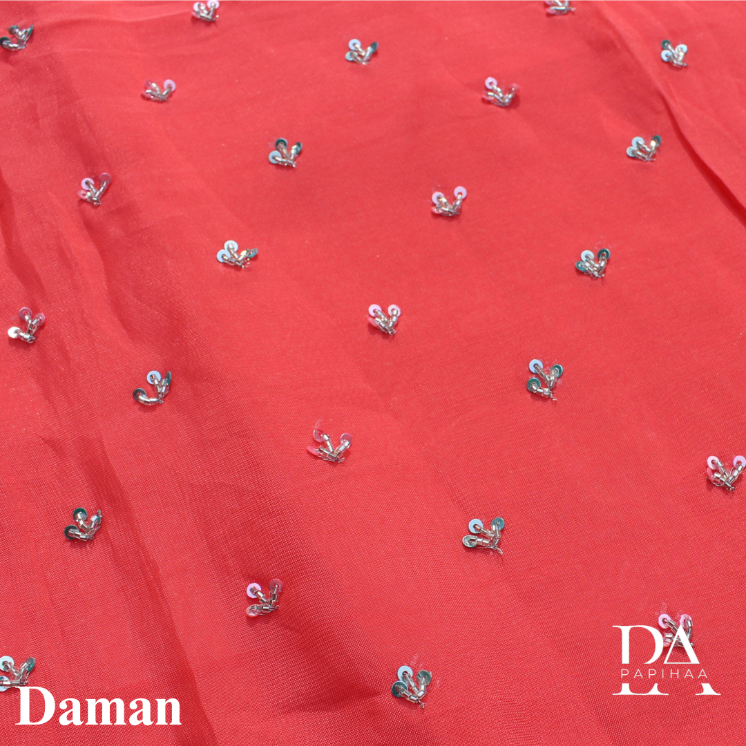 Kurta: Organza Top with ditsy work and heavy daman work on the hemline
