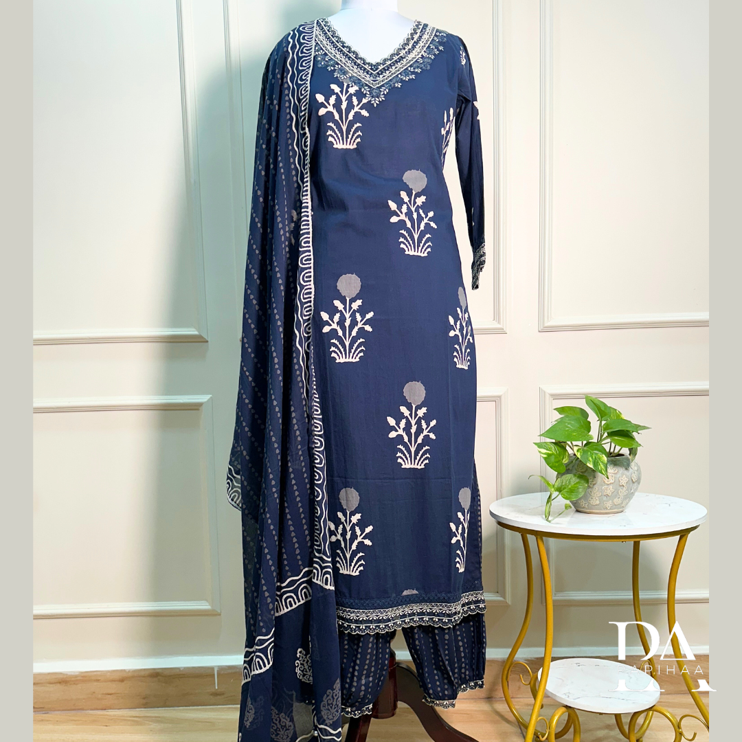Pants: Cotton Afgani fit pants, printed and adorned with organza embroidered lace hem