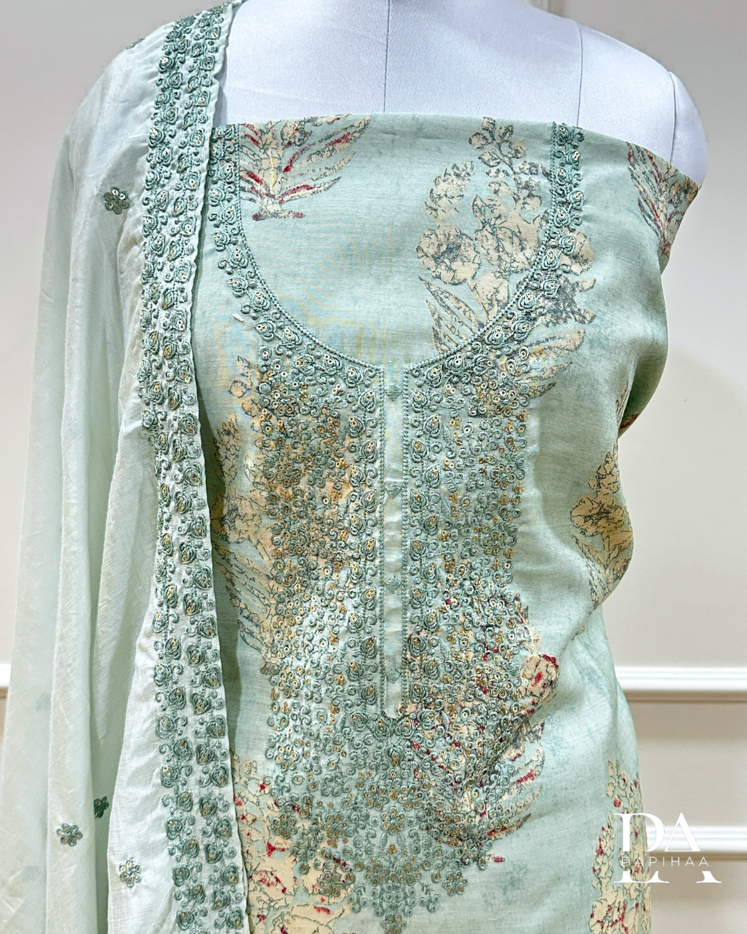 Leher Threadwork and Sequins sage green modal Ready to Stitch set