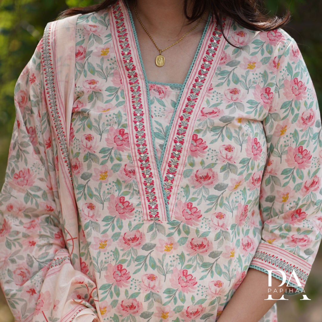 Kurta: Peachy Pink coloured cotton printed kurta with V neck adorned with lace and sequin work, lace work on sleeves and side hemlines make the top look more beautiful