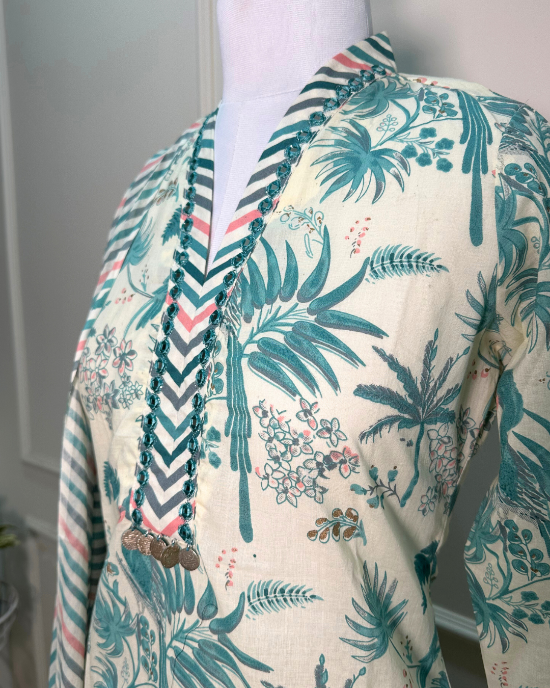 Neck & Sleeves: Comfortable V-neck with handwork attached mirrors, metallic tassel drops on the neck add a charm. Sleeves are 3/4th length and roomy with borders.