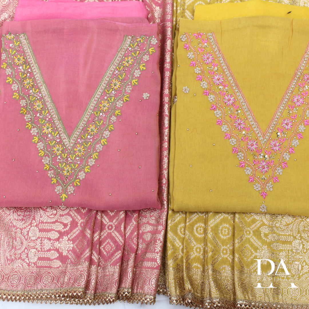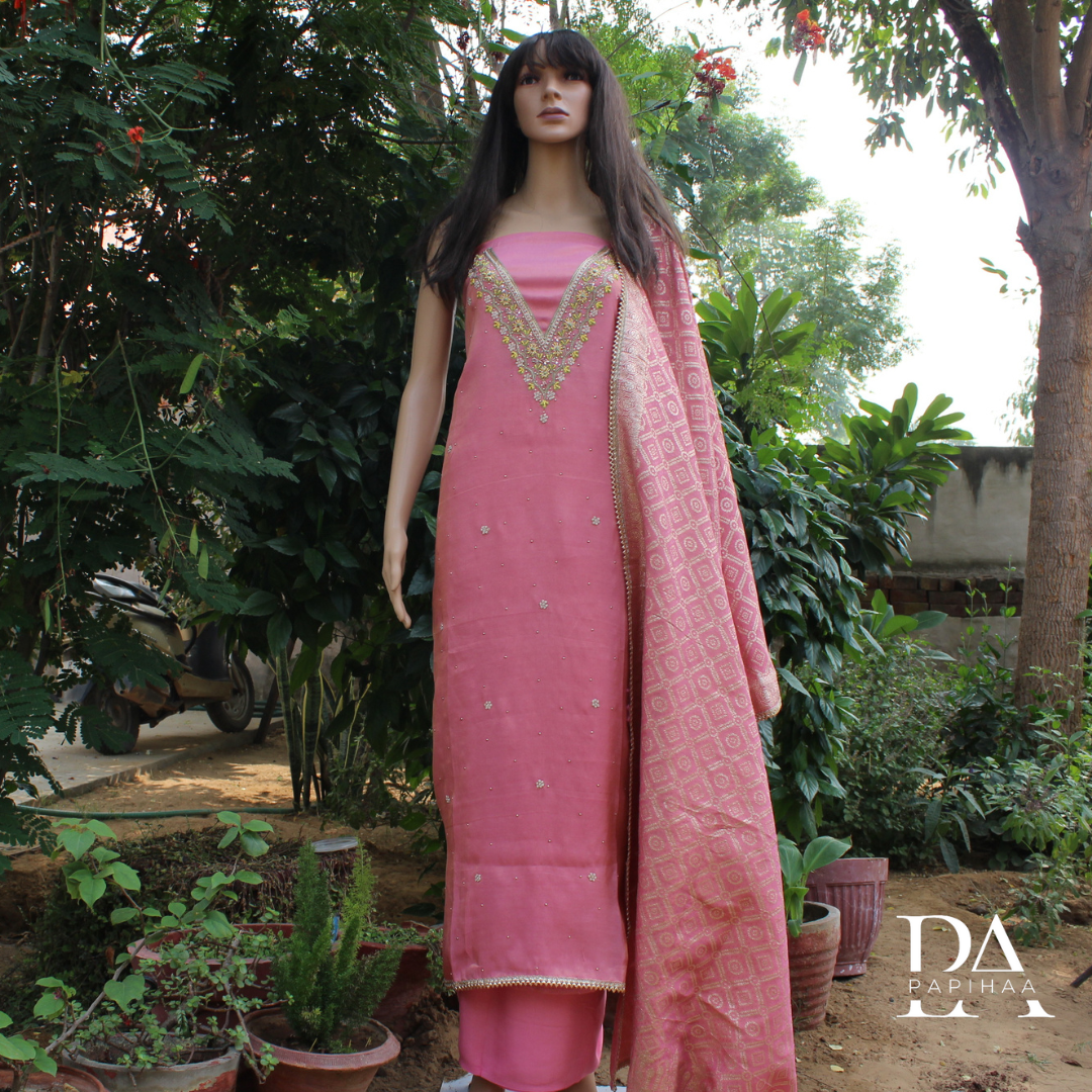 V Neck Shimmer Dola Unstitched Set