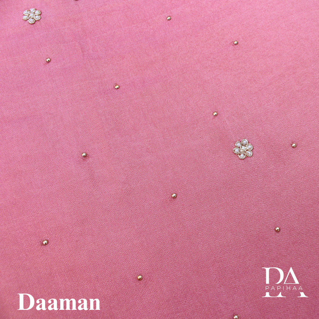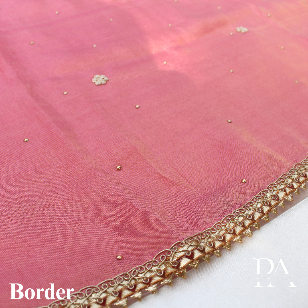 Kurta: Shimmer Dola Top with beads and embroidery on the v-neck with lace work on the hemline